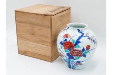 十二代 今泉今右衛門作 色絵 錦梅牡丹図 高さ約19cm 華やかな絵付けが美しい花瓶 共箱付き (R-085328)
