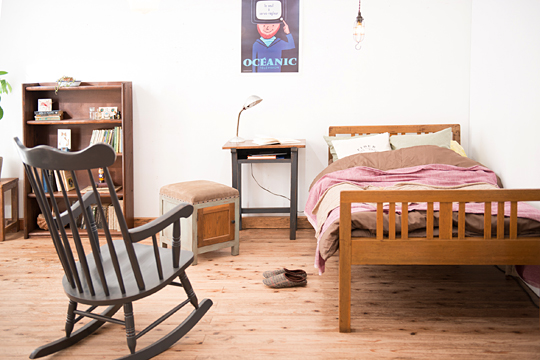 ベッド脇に置いたのは、ペイントが施されたアンティークのサイドテーブル。飴色の木製ベッドフレームと並べて配置することで、良いコントラストを生んでいます。ペイントカラーは落ち着きを感じさせるマットなブラックで、ゆっくり休みたい寝室にもぴったりですよ。お部屋に置いているロッキングチェアとカラーを合わせているのも、インテリアに統一感を持たせるポイントです。