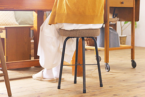 店舗で実際にアンティークスツールを見る場合は、試しに座ってみると思います。その際外出先だからと、ついつい靴を履いたまま座って判断してしまいがちです。けれども実際に家で使う際は、靴を脱いで座りますよね。スツールは背もたれがありませんから、脚の感覚は大切です。実物を見て購入できる場合は、せっかくですから靴を脱いで座ってみることをおすすめします。