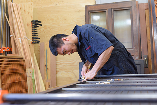 建具の製作と取り付け。これが主な仕事ですが、新築住宅に合わせて新しく作ることもあれば、建付けが悪くなったり開閉がスムーズにいかなくなった建具の修理、調整などを手掛けることもあります。 建具職人には、建具を開口部の寸法にピッタリ合わせる正確さが求められるため、手先が器用で細かい作業に集中できる人の方が向いているかもしれません。