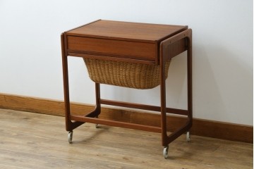 デンマークヴィンテージ チーク材 キャスターとカゴ付きで便利なソーイングワゴン (R-076005)