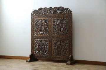 アジアンヴィンテージ オリエンタルクラシックデザイン ペイズリー柄や植物文様の緻密な彫刻が目を惹く衝立て (R-084477)