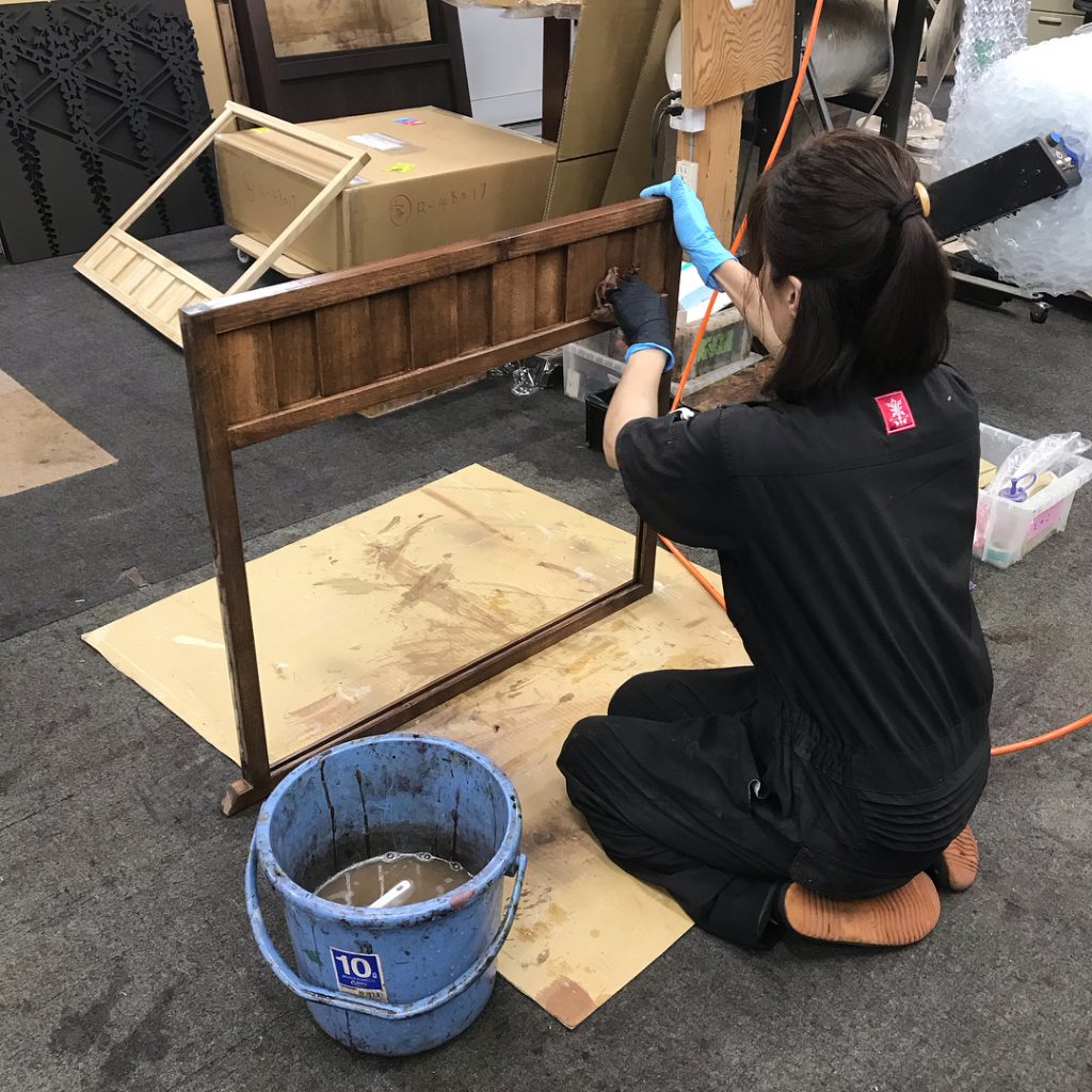 組み上がった衝立のフレームもフィニッシングブースで仕上げの着色が進行中です!