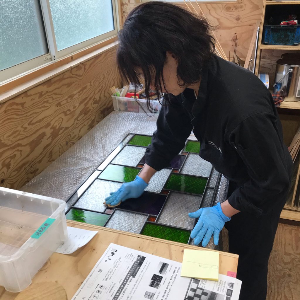 お客様のご要望通りの配色に作られたステンドグラスを綺麗に磨き、もうすぐ完成しそうな所でした。
