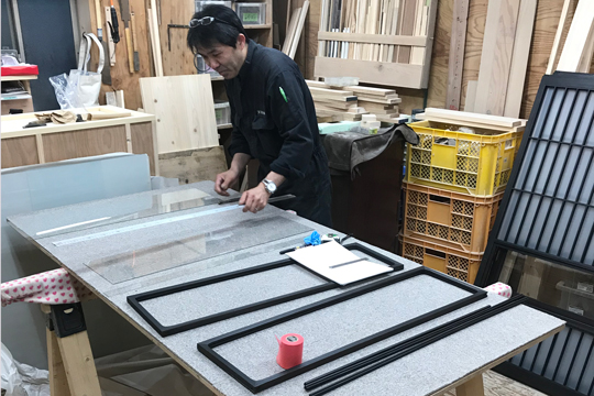 4枚の建具全てに新しいガラスを切り出してはめ込んでいきます。