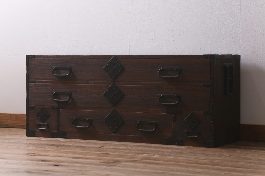 刀箪笥とは、大小の刀を収める為に作られた刀専用の箪笥です!そのため、奥行は30㎝程で、横幅は長い作りになっています。