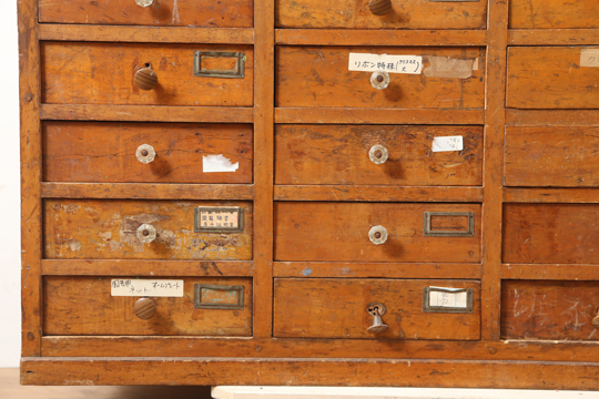 所々無くなった「つまみ」が別の物に付け替えられたり、引き出しには何回も「ネームプレート」が付け替えられた跡が見えたり、ボロになってもずっと長い間現場で活躍していたんでしょうね。