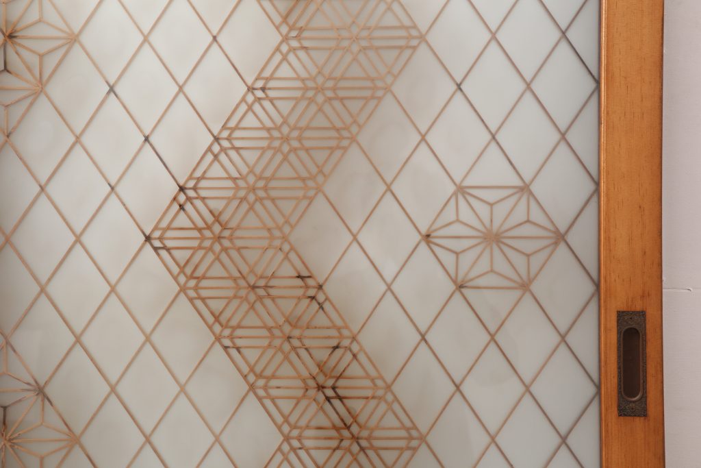 組子を挟み込んだガラスは、クリヤガラスとすりガラスの2枚に挟まれて扉の向こう側は見えないように作られていました。