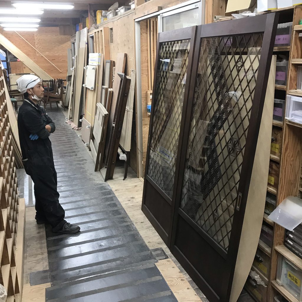 製材後、組まれた建具はオリジナルの2枚と一緒に合計4枚でフィニッシングブースで着色されます!