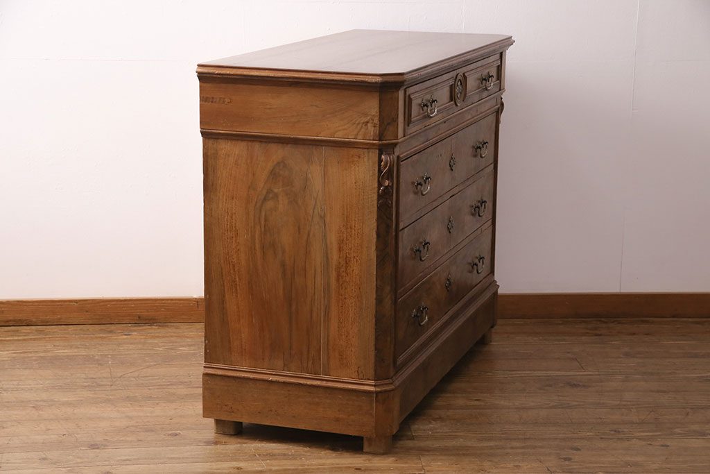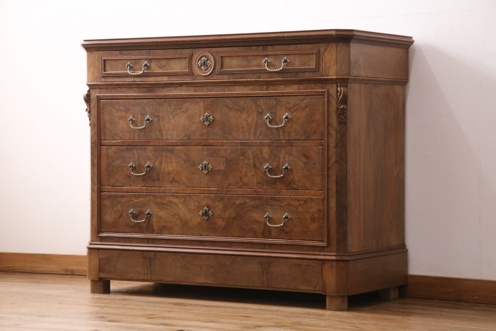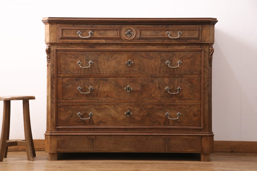 作られて100年以上経つアンティークチェストです。引き出しや角張った所も削れたり、沢山の使用傷が全体に見られます。