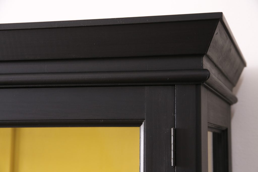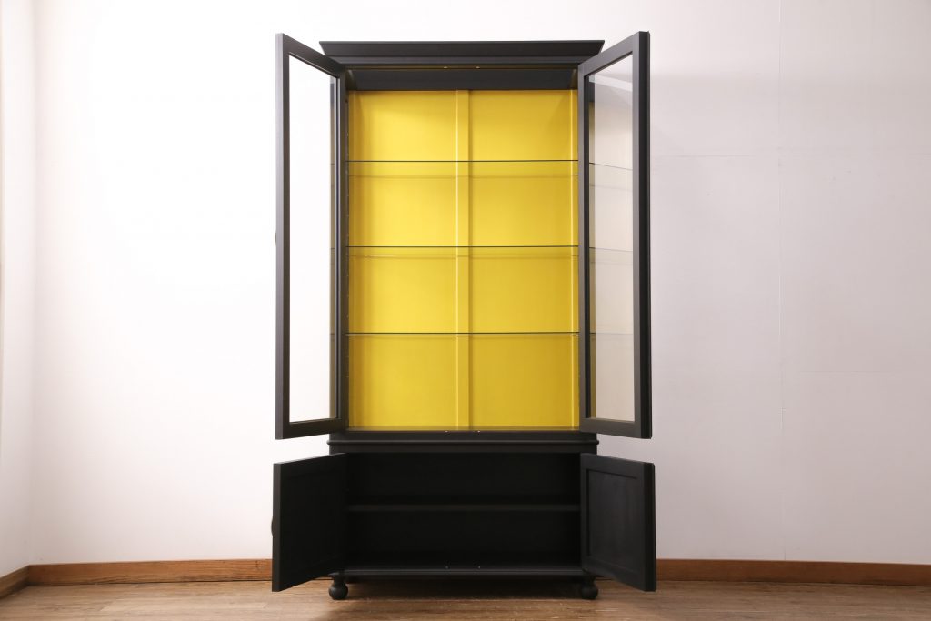 収納棚内背板にペイントされた明るいイエローが目を引くとても個性の光る仕上がりです。