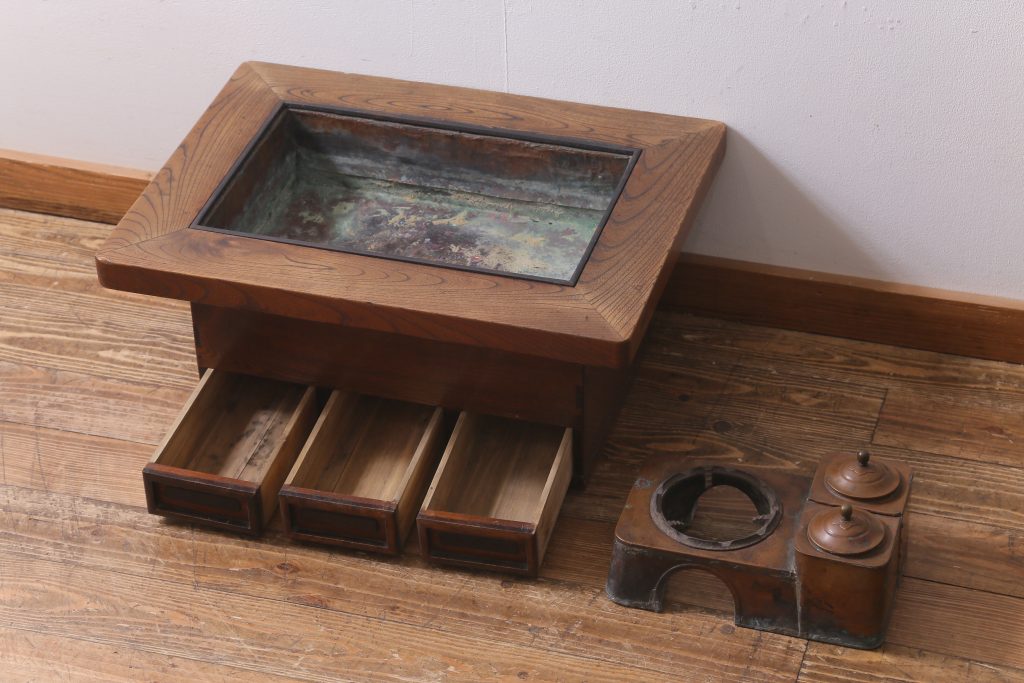 取り外せる銅製の器の囲炉裏には、鉄瓶や徳利を温める銅壺が付いています。