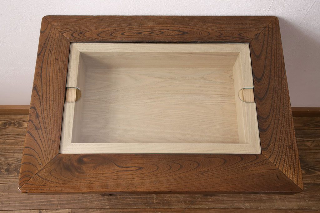 囲炉裏内をショーケースとしてリメイクし、ガラス天板は天板面全体とフラットになるように取り付けました。