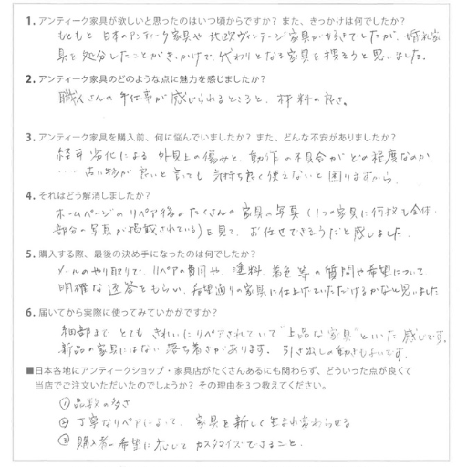 メールのやり取りで、リペアの費用や塗料、着色等の質問や希望について明確な返答をもらい、希望通りの家具に仕上げていただけるかなと思いました。