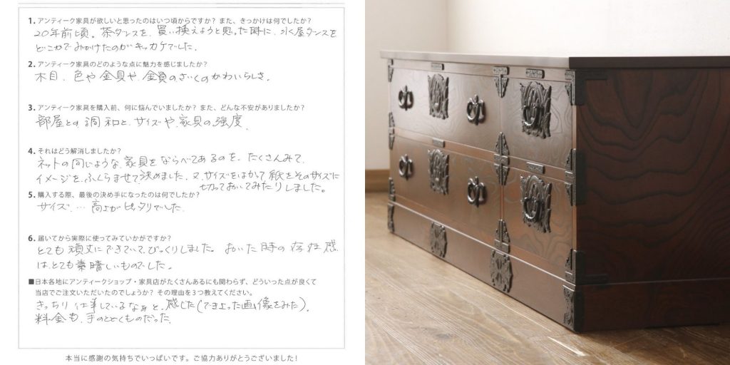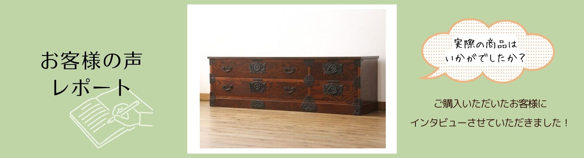 お買い求めいただいたのは、岩谷堂箪笥のローチェスト。今にも動きだしそうな力強い杢目が美しく、丁寧に造りこまれた金具と相まって上質で存在感がありますね。仕上がりやサイズにもご満足いただけたようで大変嬉しく思います。家具の時代背景を踏まえながら、材料選び、仕上げ方法などにもこだわり、一つ一つ丁寧に価値がきちんと高まるリペアを施していますので、安心してお使いになってくださいね。