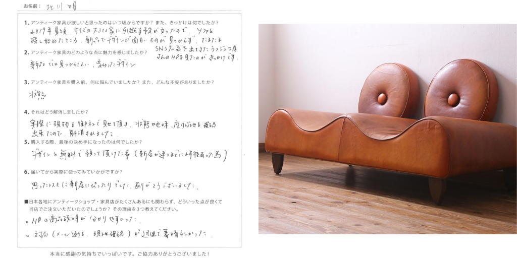 お買い求めいただいたのは、フランスビンテージの本革2人掛けソファ。オブジェのような珍しいデザインは、空間のメインアイテムとしても活躍してくれそうなひと品ですね。