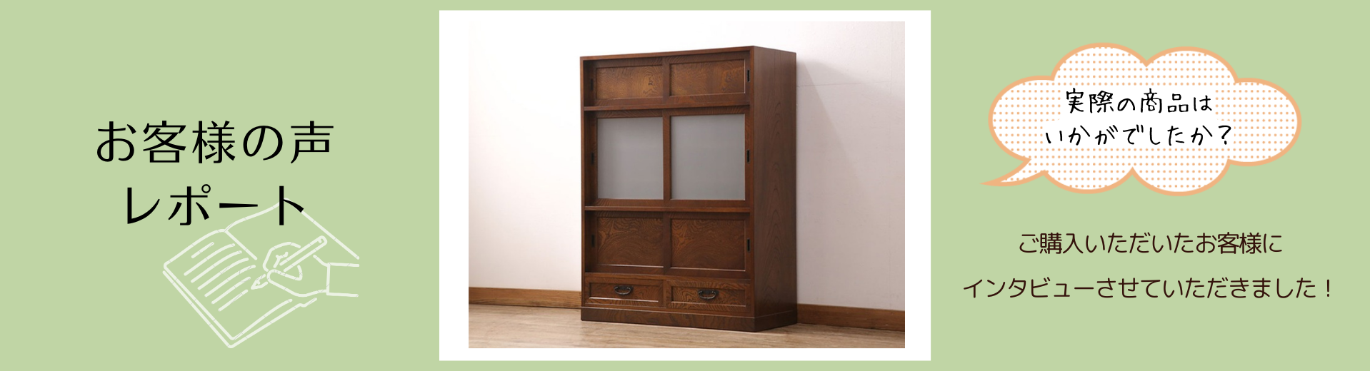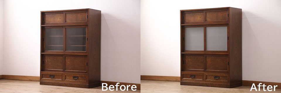 お選びいただいたのは、ケヤキ材の独特な杢目が目を引く戸棚。こちらのお品は「これから高品質リペア予定品」で、”これから”とのお名前の通り、注文をいただいてからリペアをして綺麗に仕上げる商品です。野村様にはさらにご要望をいただき、建具のガラスをクリアガラスからすりガラスへ差し替えて仕上げました。