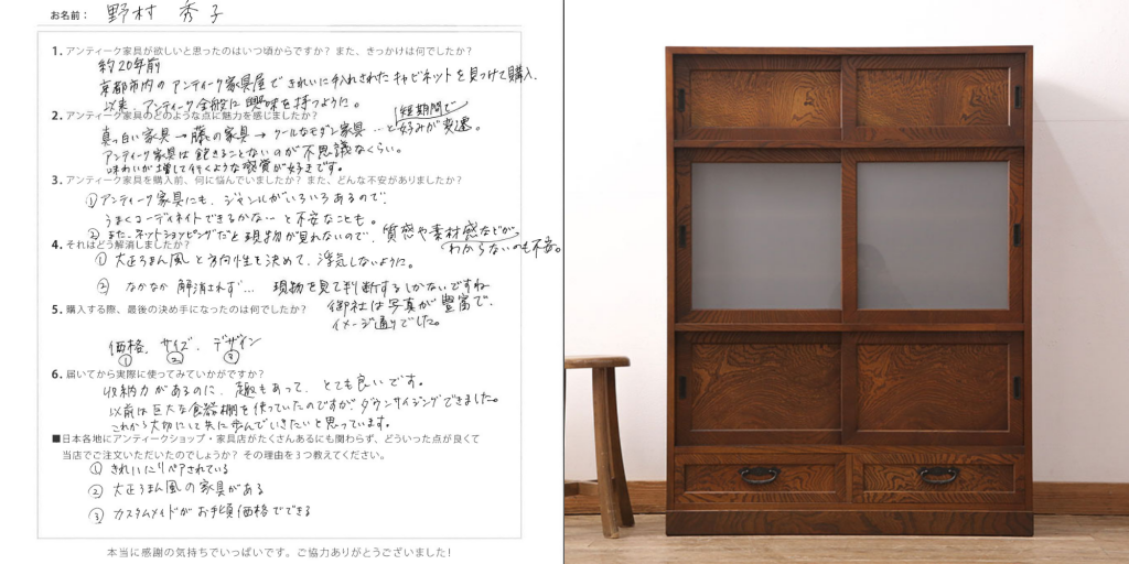 京都市内のアンティーク家具屋できれいに手入れされたキャビネットを見つけて購入。以来、アンティーク全般に興味を持つように。