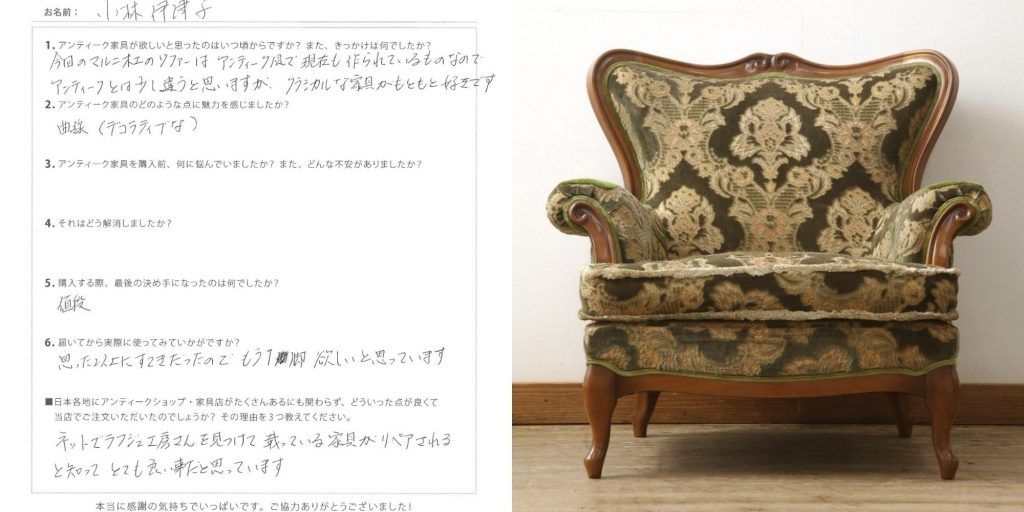 今回のマルニ木工のソファーはアンティーク風で、現在も作られているものなので、アンティークとは少し違うと思いますが、クラシカルな家具がもともと好きです。