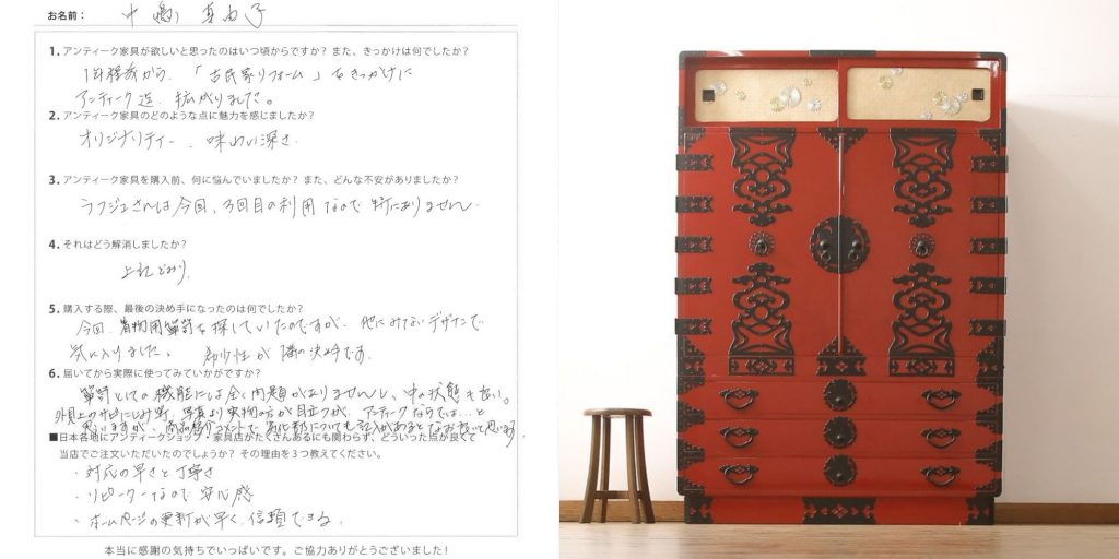 昨年度よりDREXEL HERITAGEの飾り棚からスタートし、岩谷堂箪笥、米沢箪笥と、数々のお買い物をしていただきました。「リピーターなので安心感」というお言葉を頂戴し、そして中嶋様とのこのご縁に大変感謝しております。
