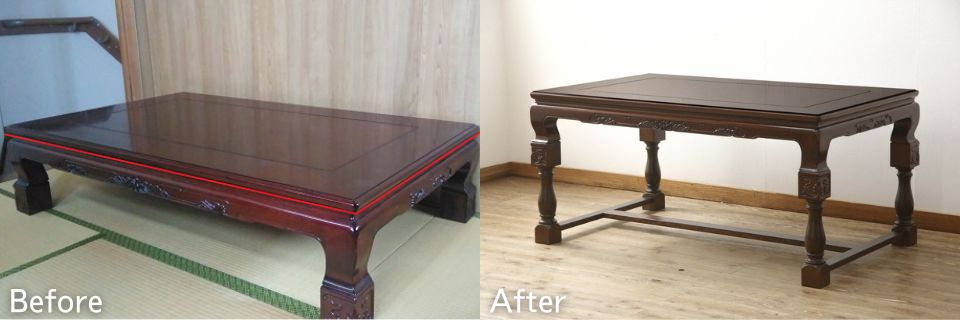 リメイクした座卓はダイニングテーブルへと生まれ変わりました。ご希望の高さになるよう新材にて製作した脚を取り付け、元の座卓のお色味に合わせた濃い茶色に着色して仕上げました。座卓の上品なフォルムや彫はそのまま活かされ、目を引くアクセントに。和風のようなアンティークのような、他にはない武下様だけの個性が光るダイニングテーブルですね。