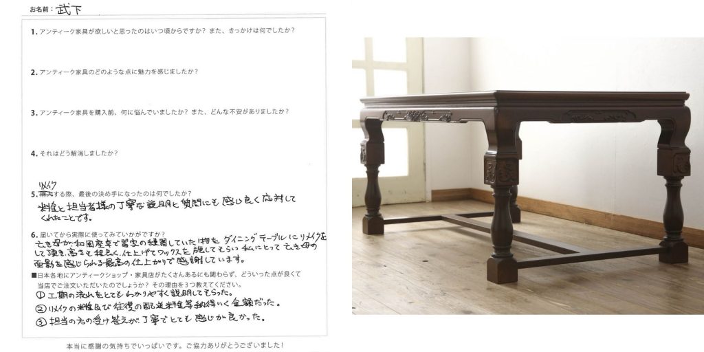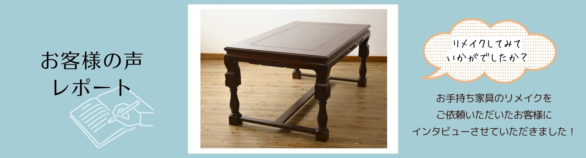 亡き母が和風座卓で習字の練習をしていた物を、ダイニングテーブルにリメイクをして頂き、高さも程良く仕上げてワックスを施してもらい、私にとって亡き母の面影を感じられる最高の仕上がりで感謝しています。