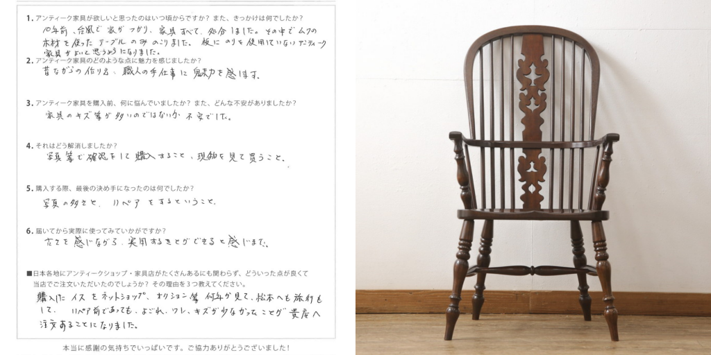 購入したイスをネットショップ、オークション等、何年か見て、松本へも旅行もして、リペア前であっても、よごれ、ワレ、キズが少なかったことが貴店へ注文することになりました。