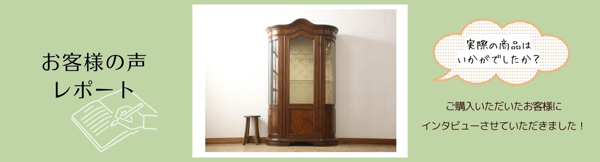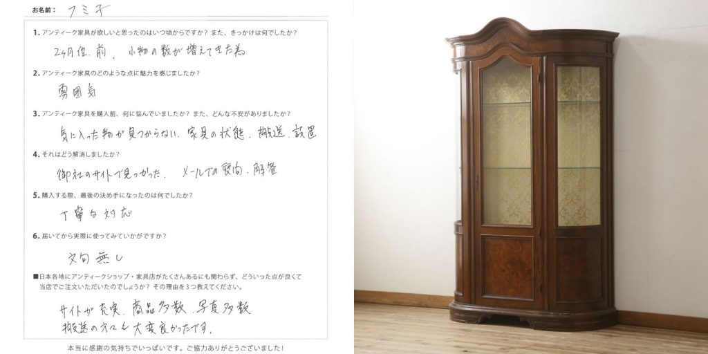 こちらのキャビネット、小物を収納する為にお使いになるとのことでした。側面、前面とガラスになっているので、光を十分に取り込み、収納したものをより一層素敵に魅せてくれることでしょう。「文句なし」とのお言葉ががいただけて、大変嬉しく思います!これからぜひ、フミ子様流のディスプレイをお楽しみくださいね♬