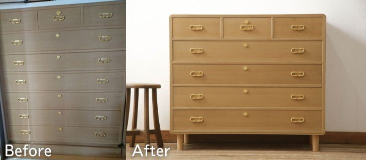 リメイクした桐箪笥は脚付のサイドチェストへ。桐材本来の木目や木色を最大限に生かし、美しい金具はそのままに、高さをリサイズし木製脚を取り付けました。もともとの桐箪笥の上品さに加え、現代にも馴染のよいデザインへと生まれ変わり、「使い勝手の良さ」「見て楽しめる家具」、そして見るたびに新婚当時を思い出させるような、そんな仕上がりになったのではないでしょうか♬