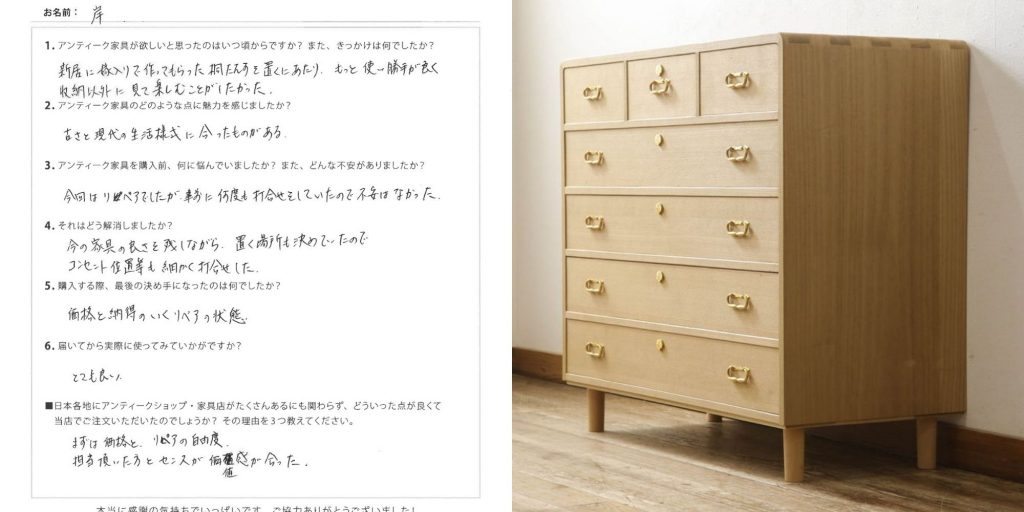 岸様には嫁入り道具の桐箪笥をリメイクするべく、当店にお任せくださいました。昨今、婚礼家具を持て余し、処分される方は少なくありません。そんな中、岸様のようにリメイクし、また新たな形となって蘇らせる事、とても素敵です!