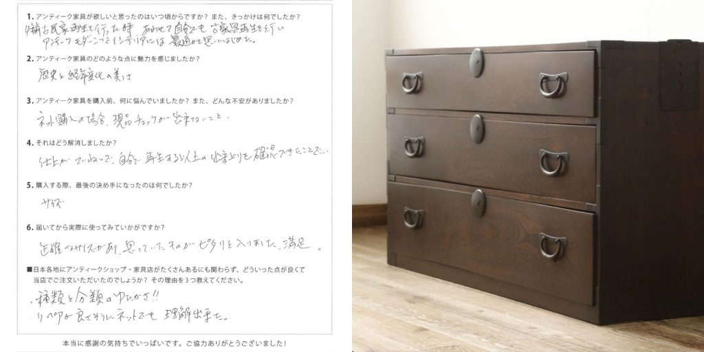 お買い求めいただいたのは、昭和初期頃に作られた仙台箪笥。こちらは「カスタムできるアンティーク家具・建具」の商品で、お客様のご要望に添い、デザイン性や長い時を経た風合い等、魅力となる部分はそのままに、綺麗で使いやすい高品質リペアを施しました。