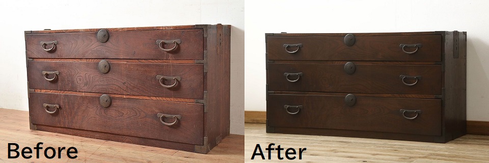 ケヤキ材の美しい杢目がより色濃くなり、上品な和を演出してくれるひと品と仕上がったのではないでしょうか。当時のままの金具も趣があって素敵です!!