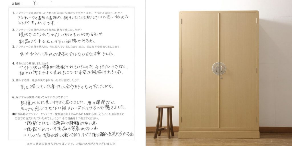 Y様も桐箪笥をお使いいただく中で、何か気になる事がございましたら、お気軽にご相談くださいね。