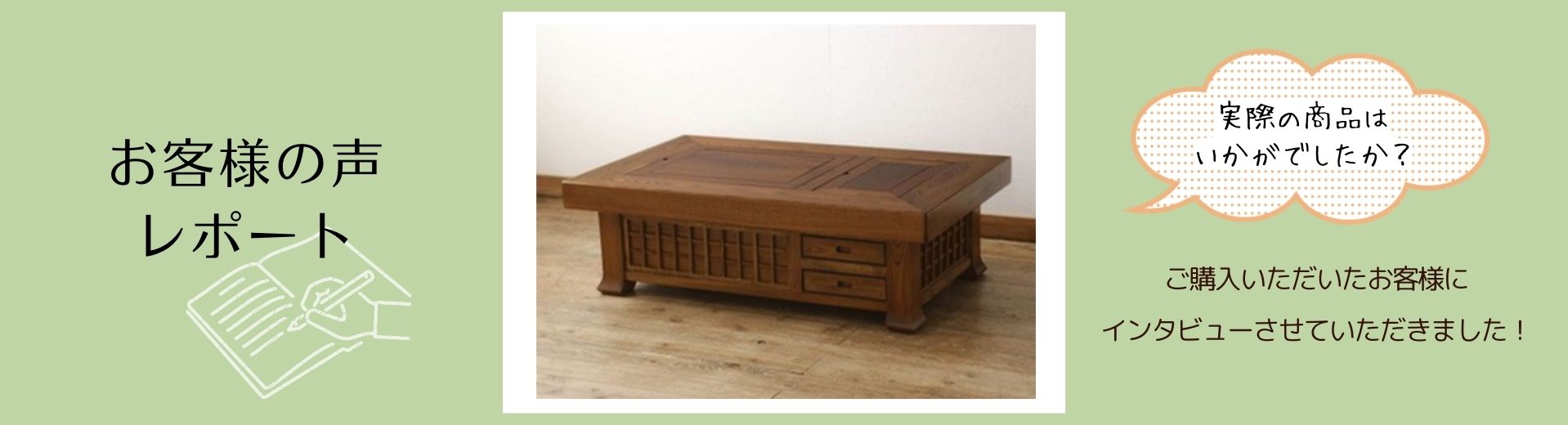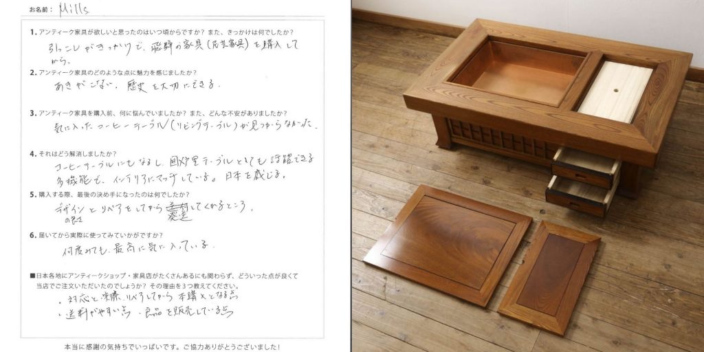 お買い求めいただいたのは、囲炉裏テーブル。欅材特有の美しい杢目がお品全体に現れた贅沢な逸品で、上質な和の情緒が感じられますね。おとしに蓋をすれば座卓としてお使いになれますし、小物収納に重宝する引き出し付きで、Mills様のおっしゃる通り大変使い勝手の良いお品です。