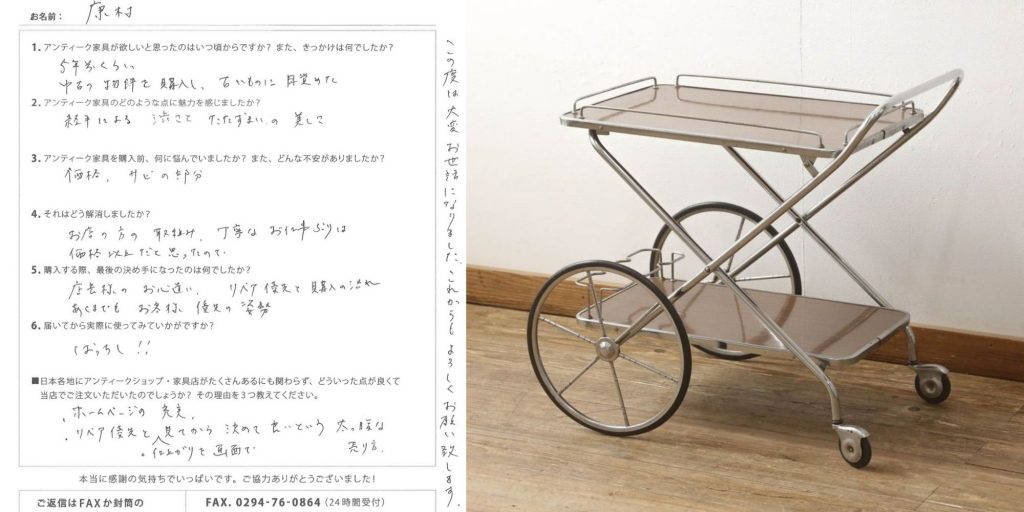 当店の取り組みについてもご理解いただき、感謝しております。当店店長も若かりし頃、インターネットでの買い物にてとても苦い経験をしました。「こんな悲しい思いを誰にもさせたくない…」という使命感から「実店舗以上にアンティーク家具を安心して購入できるネットショップを作る」と心に決め取り組んできました。