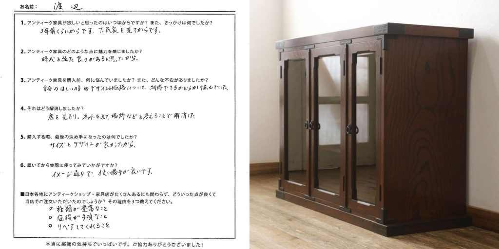 この度渡辺様にお買い求めいただいたのは、くっきりとした杢目と繊細な金具が上質な雰囲気を醸し出す岩谷堂箪笥のサイドボード。前面ガラス扉ですので、お気に入りのコレクションや食器を飾って、見せる収納をお楽しみいただけそうですね。