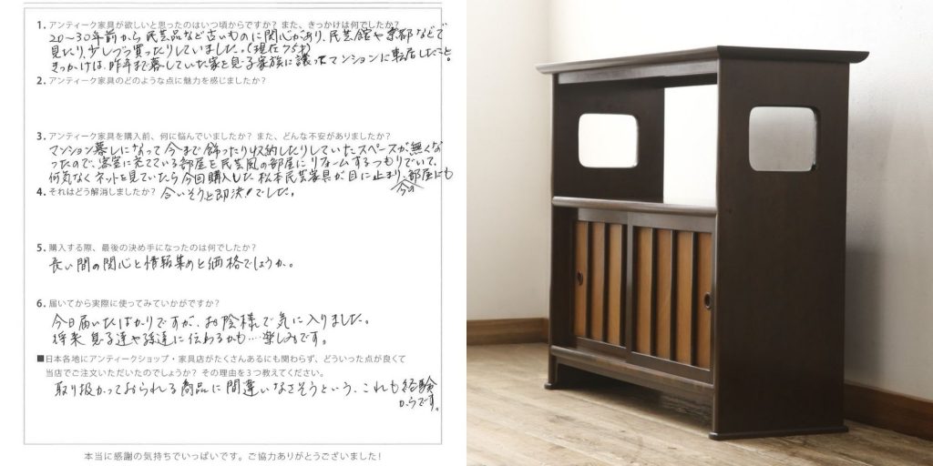 ご購入された茶タンスは、これまでお客様がお集めになった民芸品コレクションを飾るのにもピッタリ!これからマンションの一室を民芸風にリフォームするとの事でしたので、インテリアもますますお楽しみいただけそうですね。