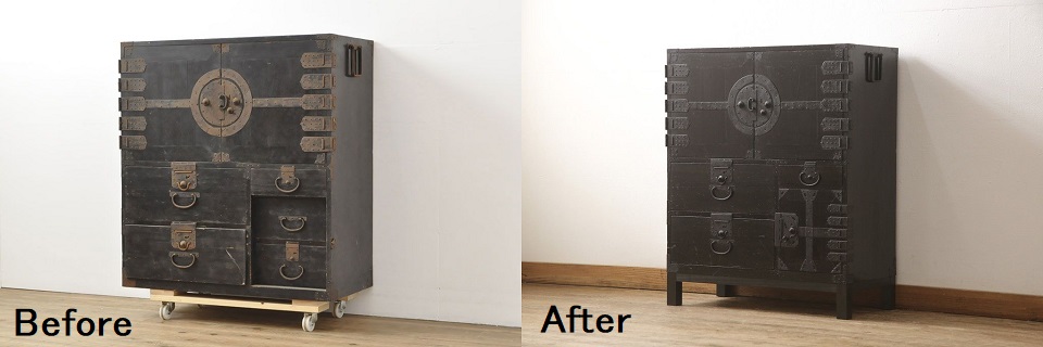 江戸期に使われた古い小箪笥をお選びいただき、リメイクをお任せくださいました。長い時代を超え刻み込まれた趣ある風合いを生かした当店自慢の高品質リペア!観音扉の中は食器棚としてもお使いできるよう引き出しを取り外し棚へ加工。木製脚も取り付けましたので、現代のお部屋にも取り入れやすい仕様へと蘇りました。
