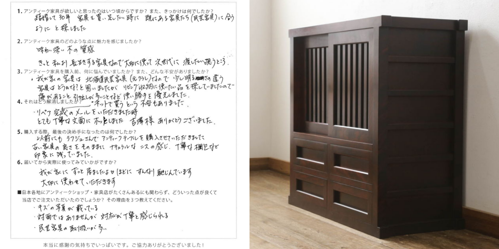 結婚して30年、家具を買い足したい時に、既にある家具たち(民芸家具)に合うようにと探しました。