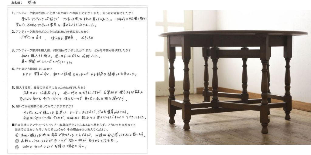 アンティーク家具がお好きとの事!10年前から集められているそうですね。この度のバタフライテーブルがお似合いになる野坂様のお宅、ぜひのぞいてみたいな~などと、わたくし一人でワクワクしてしまいました♪