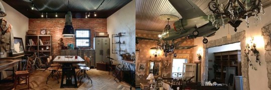 バラの入った花器を置いたテーブルをロココ調のチェアが囲む上で、大胆にも大きな飛行機模型が宙を飛んでいる光景はなかなかお目にかかれません。