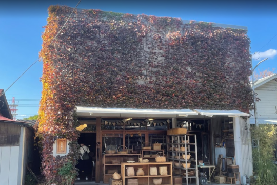 入口まではツタが及ばずポッカリと開いていて、そこには大きさも編み方も様々な籠が積み重なっています。