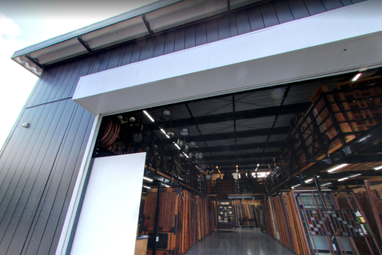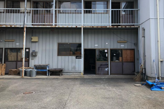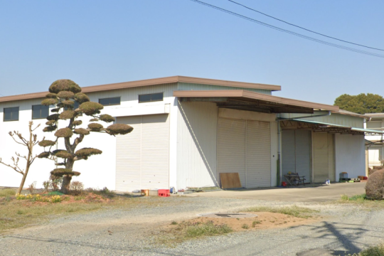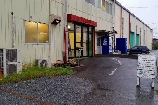 小道に入って奥に進んだ先の行き止まり、右を向いて見えるプレハブ倉庫のような建物がワームホールファニチャーです。