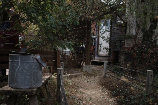 小さな森のような庭に入って、柵に沿って進んだ先にある白い扉の小屋がアンティークショップのピエニコタです。