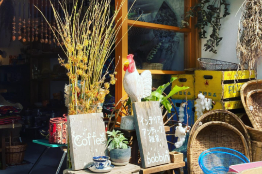 倉敷市阿知にある雑貨店「インテリア雑貨 アンティーク& coffee bobbin(ボビン)」。