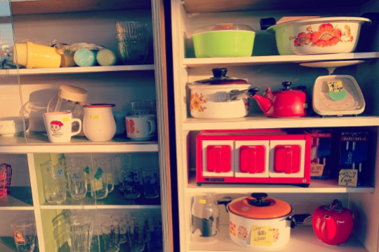 昭和の和食器やキッチン道具を中心に、曽我ガラスのキャンディポットとも呼ばれるキャニスターなどレトロ感のあるインテリア雑貨が揃っています。