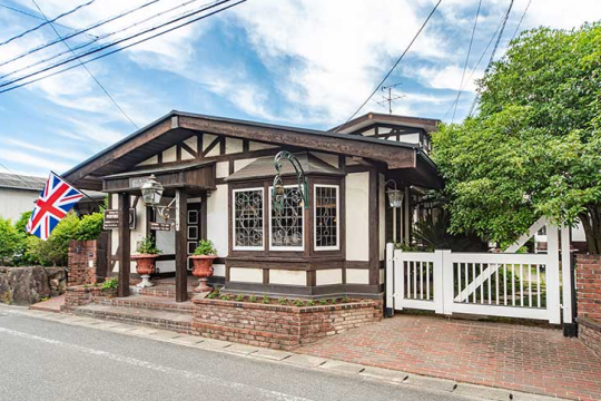 本場のアンティークショップを思わせるレンガとお庭が素敵な外観が素敵な「アンティークハウス ポートベロ」。