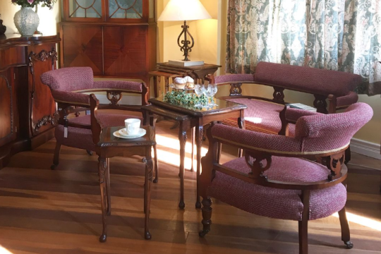 19世紀半ば~20世紀初頭のデザインのマホガニーのソファとテーブルのセットは、まるでタイムスリップしたかのようでドキドキします。