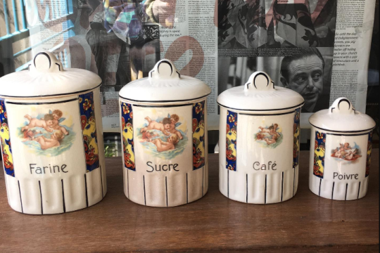 蓋の取手と天使の絵柄が可愛いフランスアンティークキャニスターのセット、左からフランス語で小麦粉・砂糖・コーヒー・コショウと書いてあります。