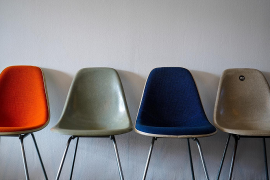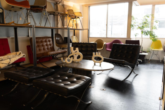ジェフリーハーコート、イームズ、ノルなど、色々なデザイナーズチェアがずらっと並んでいて、オシャレな空間が広がっています。